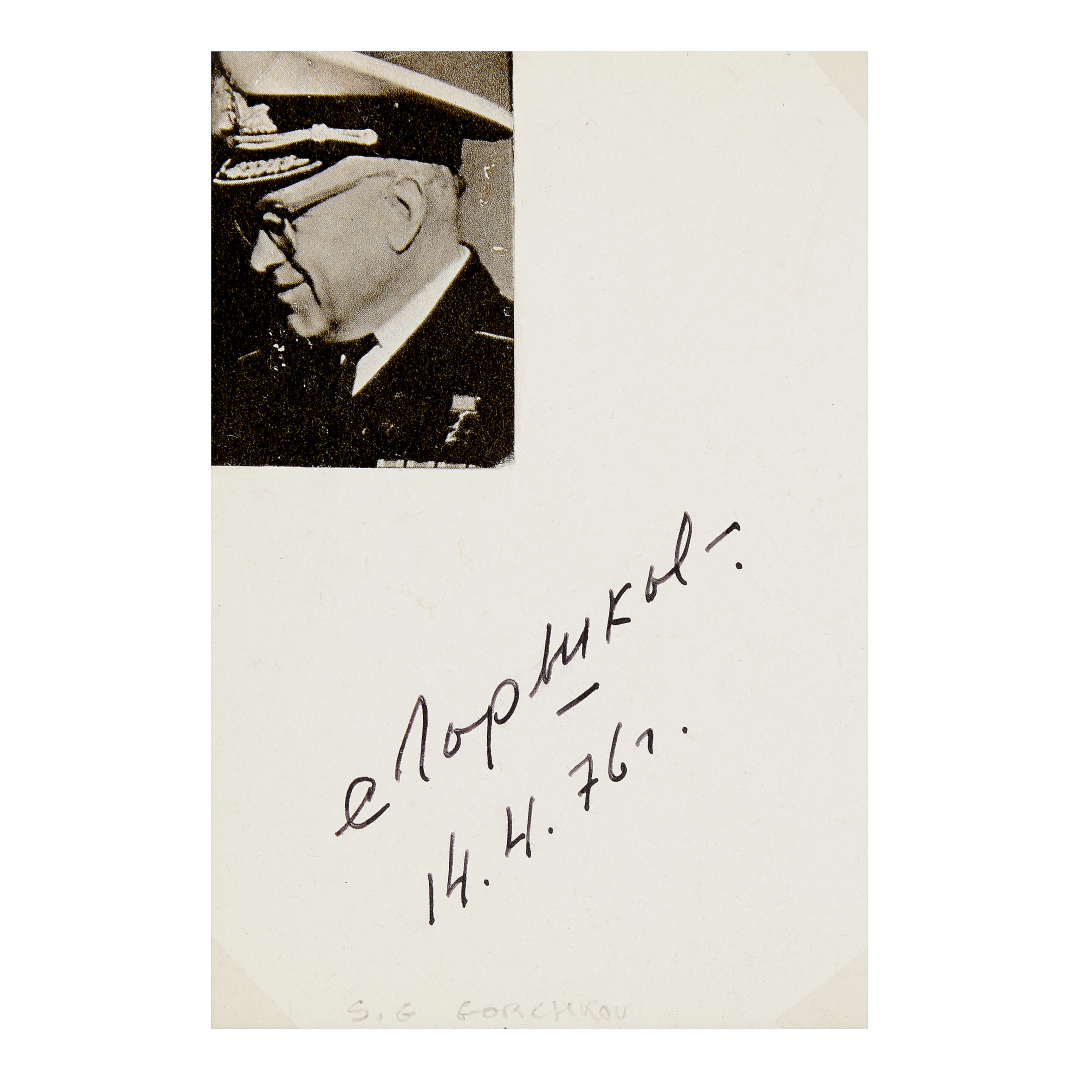 Gorchkov, Sergej. Firma autografa al retro di piccola fotografia (100 x 70 mm) con data “14.4.76” (foto in bianco e nero ritagliata da rivista incollata a fianco) del militare sovietico, comandante supremo della flotta navale russa dal 1967 al 1985. Allegata lettera dattiloscritta con la quale in data “21 maggio 1976” l’addetto militare presso l’ambasciata dell’U.R.S.S. in Italia invia la foto a Rolando Sensini a Macerata.