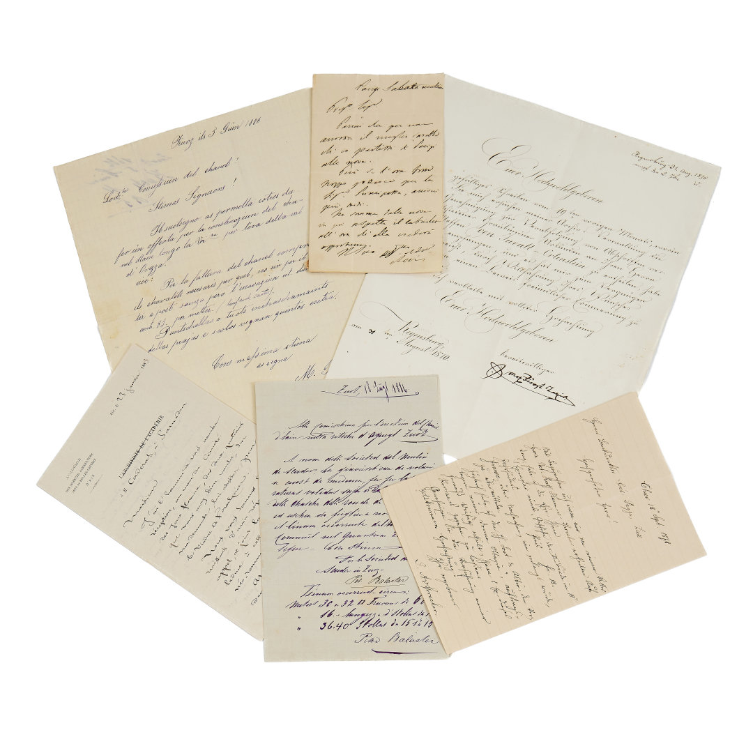 [Ottocento]. Insieme di una dozzina di autografi di personalità soprattutto straniere tra i quali tuttavia spicca una lettera di una pagina in 16° di Pellegrino Rossi da “Parigi, sabato mattina” indirizzata “Monsieur Bianchi” in Place de la Madeleine. “Parmi che… sarebbe ch’io partissi da Parigi alle nove. Però se l’ora fosse troppo precoce per la Sig.ra Principessa, arriverei più tardi”.