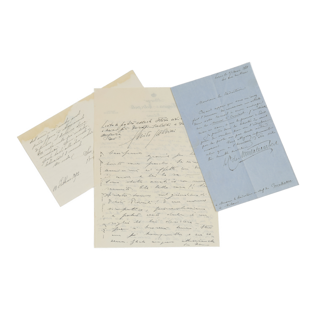 [Risorgimento]. Interessante gruppo di lettere di politici e intellettuali vissuti in periodo risorgimentale. Comprende una lettera autografa di Ruggiero Bonghi, Ministro dell'Istruzione, filologo e frequentatore del Gabinetto Vieusseux, 2 pagine in 8°, recante la data "18 Febbraio 1892" e contenente interessanti riflessioni filosofiche: "Amore è un demone e come tale è parte di quel mondo demoniaco o demonico che intermezza tra l'umano e il divino. Così è inteso nel Convito. Il demonion di Socrate ha la sua vita e la sua scaturigine in questo mondo stesso, ma differisce dall'amore [...] resta nella sua indeterminatezza". Nel lotto, tra le altre, anche una lettera in francese di Charles Forbes René, conte di Montalembert, spedita al "Redacteur en chef" del Conciliatore di Milano e datata "Paris le 17 mai 1861", e tre lettere firmate dal Ministro della Guerra, Giovanni Bruzzo.