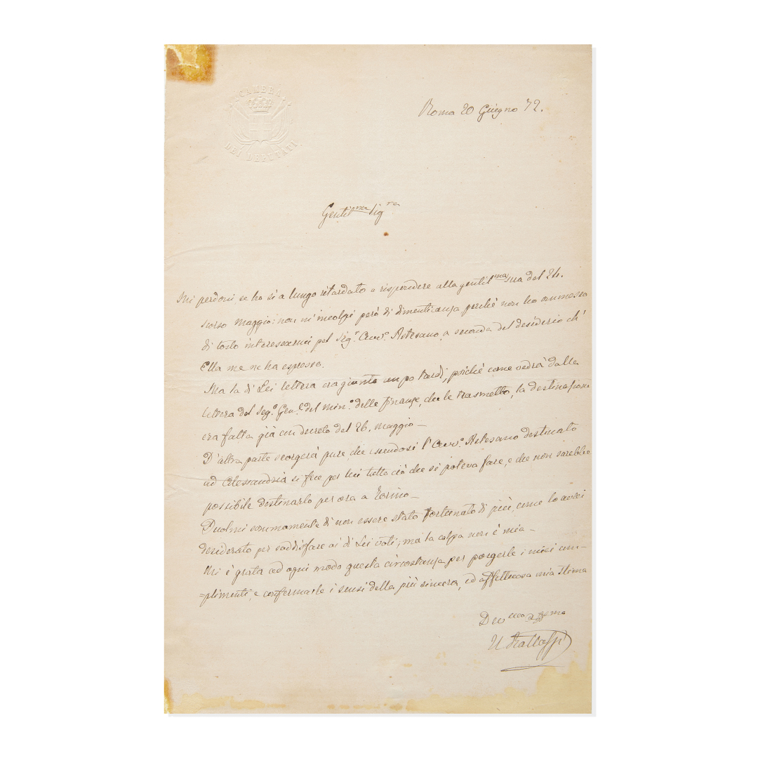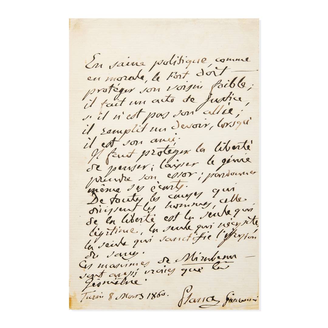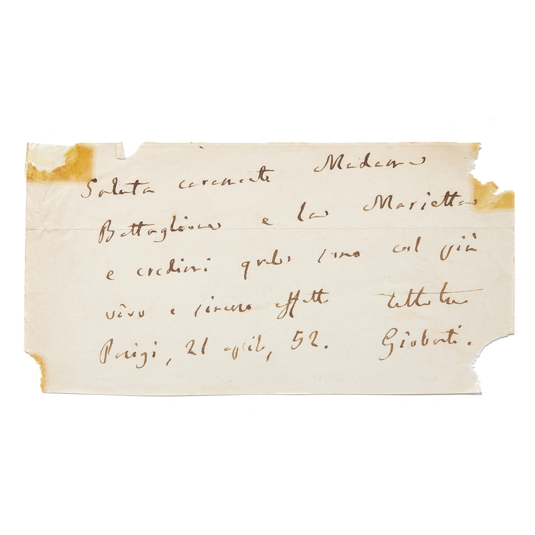 [Risorgimento]. Interessante insieme di 3 documenti autografi di personaggi di spicco del periodo risorgimentale, che comprende una breve lettera di Vincenzo Gioberti, datata "Parigi, 21 aprile, 52" e indirizzata ad amiche salutate con "vivo e sincero affetto", un foglio di appunti autografi firmati da Giovanni Plana, 1 pagina in 8° con data "Turin 8 Mars 1860". L’importante matematico e astronomo vi trascrisse alcune massime e brevi riflessioni etiche, politiche e sulla libertà di pensiero ("Il faut protéger la liberté de penser"), concludendo che esse si sarebbero potute riferire benissimo anche alla Geometria. È inclusa infine una lettera autografa di Urbano Rattazzi, 1 pagina in 8°, datata "Roma 20 Giugno 72". Inviata a una signora, insieme a un documento del ministro delle Finanze, per scusarsi di aver risposto alla destinataria, quando ormai era troppo tardi per soddisfare la sua richiesta di un trasferimento a Torino dell’avvocato Astesano.