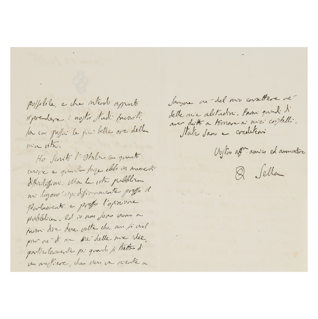 Sella, Quintino. Lettera autografa firmata "Q Sella" e datata "Torino 12/2/66", 2 pagine in 8° su carta intestata del Senato, con cui il grande scienziato, alpinista e politico confessa il suo scoramento e la sua volontà di allontanarsi dalla vita politica, per dedicare più tempo e impegno agli amati studi di mineralogia: "Caro Amico, i miei più cordiali e più vivi complimenti pel vostro magnifico lavoro sugli strati ad Avicula contorta. Tomo veramente ad onore della scienza italiana. Io non posso poi ringraziarvi abbastanza del cortese dono che me ne fate. È forse un richiamo alla scienza che intendete farmi? [...] Ebbene io vi dirò che ne sto il più che posso al largo dalla vita politica, che andrò alla Camera il meno possibile e che intendo appunto riprendere i nostri studi favoriti, fra cui passai le più belle ore della mia vita. Ho servito l'Italia con quanto cuore e quante forze ebbi in momenti difficilissimi. Ma la vita pubblica mi logorò [...] Ed io non sono uomo a farmi dire due volte che non si vuol più né di me né delle mie idee [...] Parmi quindi di aver dritto a tornare ai miei cristalli". Il "Caro amico", destinatario dell'epistola, è da identificarsi con l'abate Antonio Stoppani, geologo e autore in quegli anni del citato volume sugli strati ad Avicula contorta.