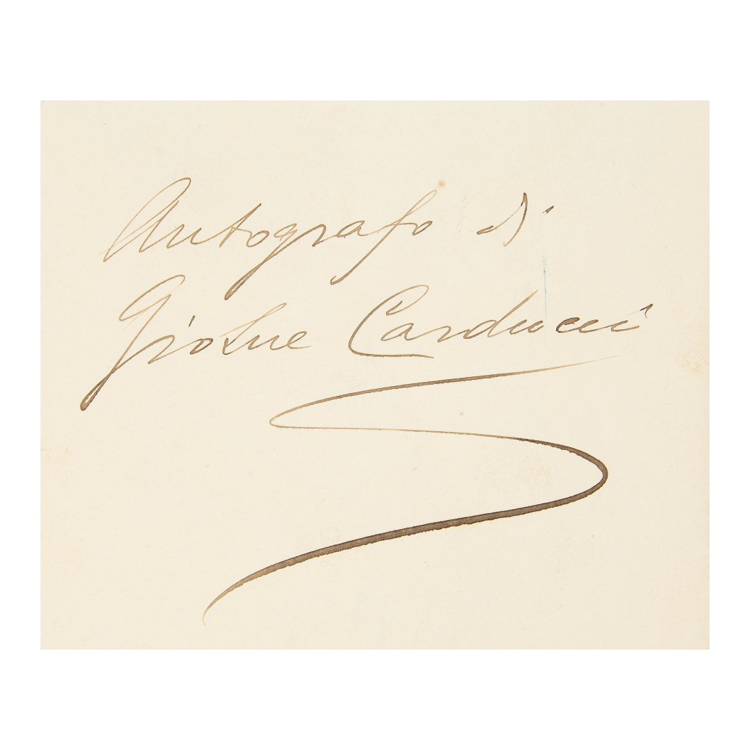 Carducci, Giosuè. Piccola busta (90 x 180 mm) con firma autografa del poeta, primo italiano, insieme a Camillo Golgi, a vincere un premio Nobel nel 1906, autore delle celebri raccolte Odi barbare, Rime nuove e Rime e ritmi. Da notare come sulla busta si legga "Autografo di Giosue Carducci", con la forma del nome non accentata, a cui Carducci fece ricorso molto di frequente per firmare a partire dal 1875 circa e che volle poi stampata sul frontespizio dell'ode La guerra, edita da Zanichelli nel 1891. Egli forse cominciò a preferire questa forma, perché volle richiamarsi all'antica tradizione grafica, che considerava ossitone le parole di origine non latina, senza bisogno di segnare l'accento. Lotto accompagnato da copia del certificato di autenticità della Libreria Antiquaria Pontremoli.