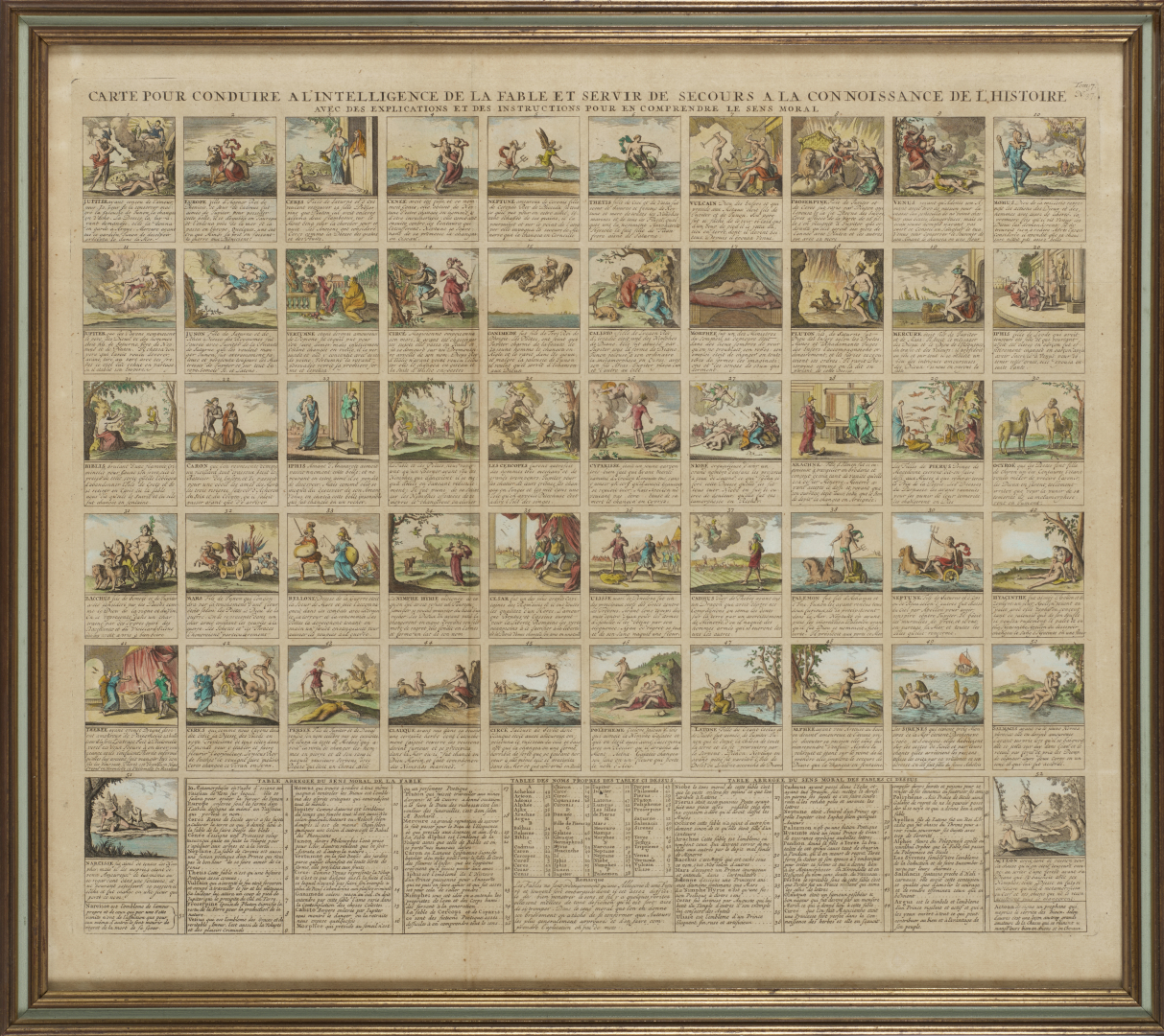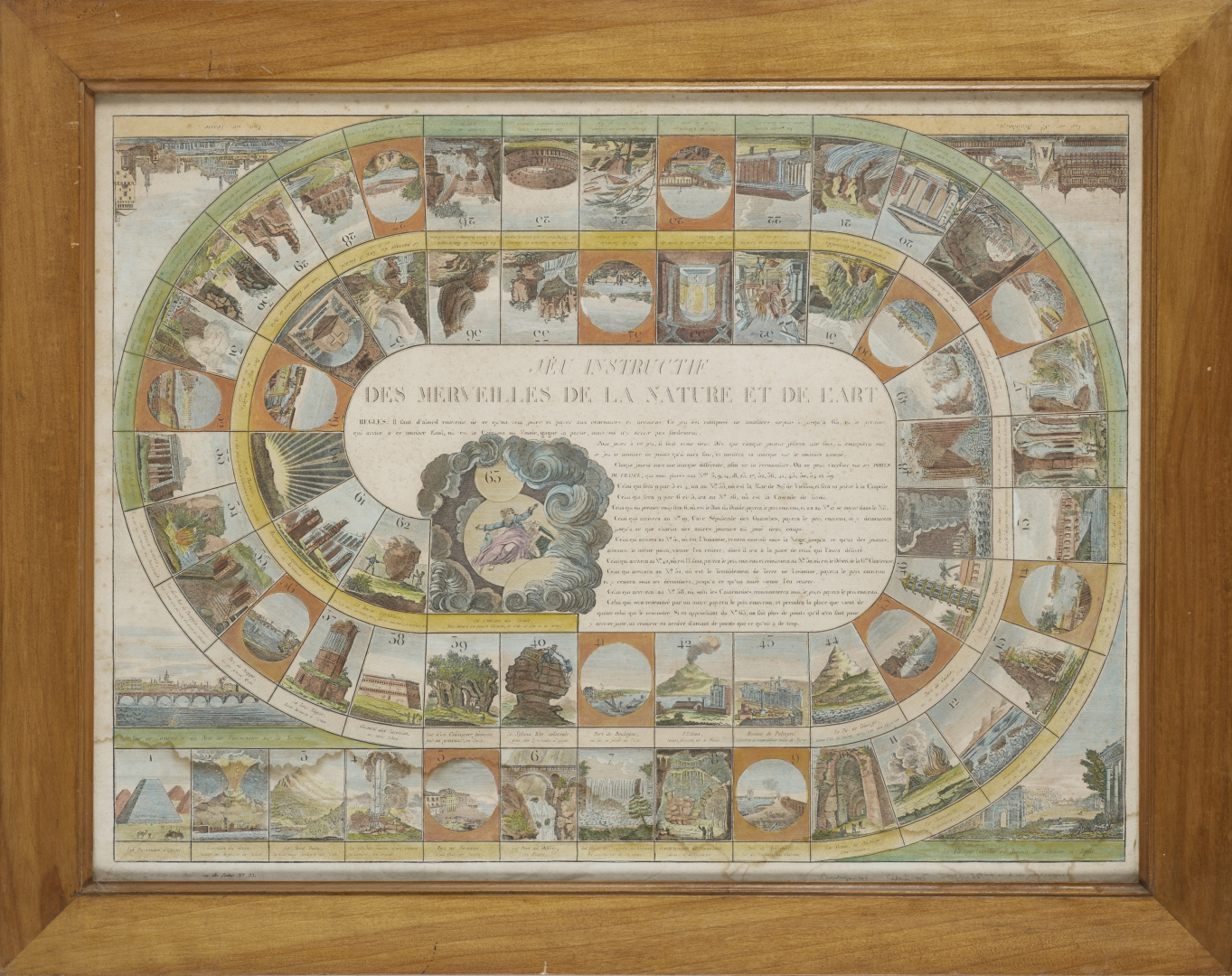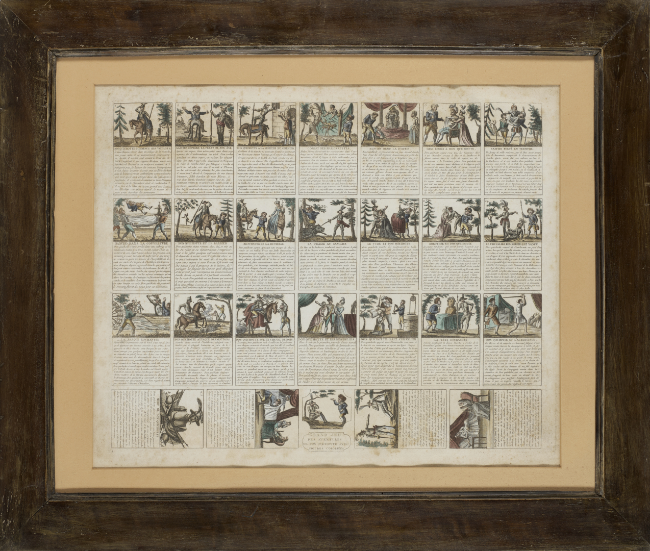 [Gioco da salotto]. Grand Jeu des aventures de Don Quichotte avec figures coloriées (445 x 530 mm). Xilografia del 1810 circa con coloritura coeva. Con passe-partout, entro cornice. Nel lotto anche Carte pour conduire al'intelligence de la fable et servir de secours a la connoissance de l'histoire del secolo XVIII in bella coloritura, e Jeu instructif des merveilles de la nature et de l'art, acquaforte di Basset del 1825 circa con coloritura coeva, Ciompi & Seville 202.
