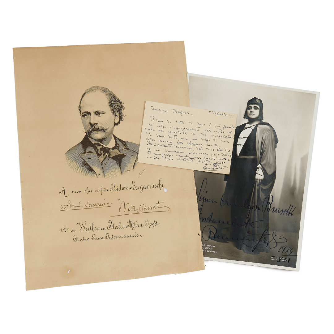 [Musica]. Piccolo insieme di autografi in cui spiccano un biglietto di Arrigo Boito, una dedica (“cordial souvenir”) di Jules Massenet su proprio ritratto litografico distribuito in occasione della prima rappresentazione italiana di Werther (Milano, 1894), e una bella fotografia con dedica (235 x 175 mm) del tenore Beniamino Gigli in abito di scena nelle vesti del protagonista di Romeo e Giulietta di Charles Gounod.
