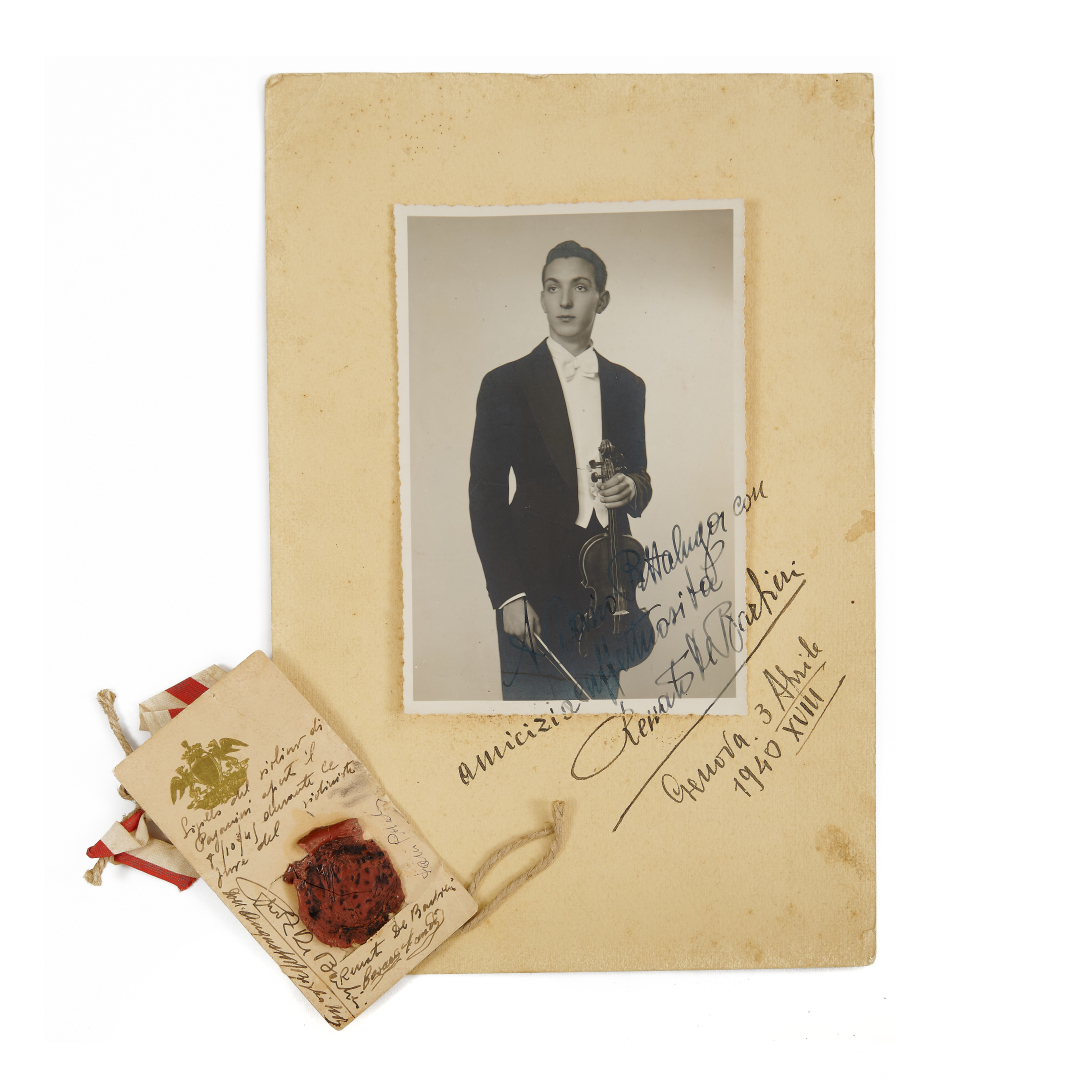 [Paganini]. De Barbieri, Renato. Firma autografa e dedica, datata "Genova 3 aprile 1940", su ritratto fotografico in bianco e nero montato su cartoncino (310 x 210 mm). De Barbieri, giovane e talentuoso violinista genovese, partecipò in quell'anno alle celebrazioni per il centenario della morte di Nicolò Paganini e il 9 ottobre del 1945 si esibì in concerto al palazzo comunale di Genova, suonando il Cannone, famosissimo violino di Paganini. Egli poté suonare di nuovo lo strumento nel 1947 per il cortometraggio La Voce di Paganini, premiato alla Mostra del Cinema di Venezia, e in vari concerti. Il lotto comprende anche il programma del citato concerto di Genova del 1945 e un sigillo in ceralacca, che fu impresso con il "violino di Paganini [...] l'8/10/45 durante le prove del violinista" e conservato su un biglietto di carta con firma autografa di Renato De Barbieri e degli altri musicisti.