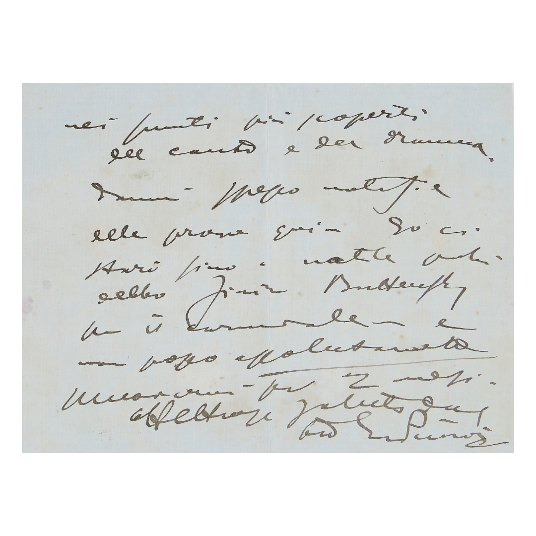 Puccini, Giacomo. Interessante lettera autografa del musicista con busta affrancata indirizzata da “Torre del Lago 3.11.903” al maestro Francesco Spetrino presso il Teatro Imperiale di Vienna. “Ricevo qui la tua carissima. E’ inutile che ti raccomandi la mia Bohéme – so come tu sia artista coscienzioso – ma siccome i Tedeschi sono un po’ duri… raccomandoti di essere eccessivamente severo sulla leggerezza dell’interpretazione… Dammi spesso notizie delle prove qui. Io ci starò fino a Natale perché devo finire Butterfly…”. Tre pagine in 8°.