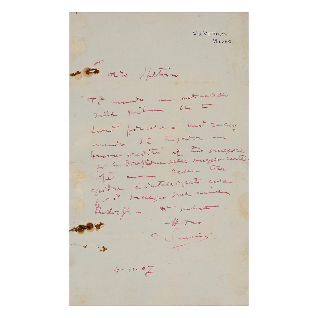 Puccini, Giacomo. Lettera autografa firmata, datata "4.11.07", 1 pagina in 8°. Venne inviata dal grande musicista toscano a Francesco Spetrino, all'epoca direttore d'orchestra delle opere italiane alla Wiener Hofoper, per ringraziarlo di aver contribuito al recente successo viennese della Madama Butterfly: "Ti mando un articoletto della Tribuna che ti farà piacere. [...] Grazie ancora delle tue assidue e intelligenti cure per il successo della mia Butterfly". Conservato anche il piccolo ritaglio di giornale, a cui Puccini accenna e che spedì insieme alla missiva. Pieghe, macchie di umidità nei margini.