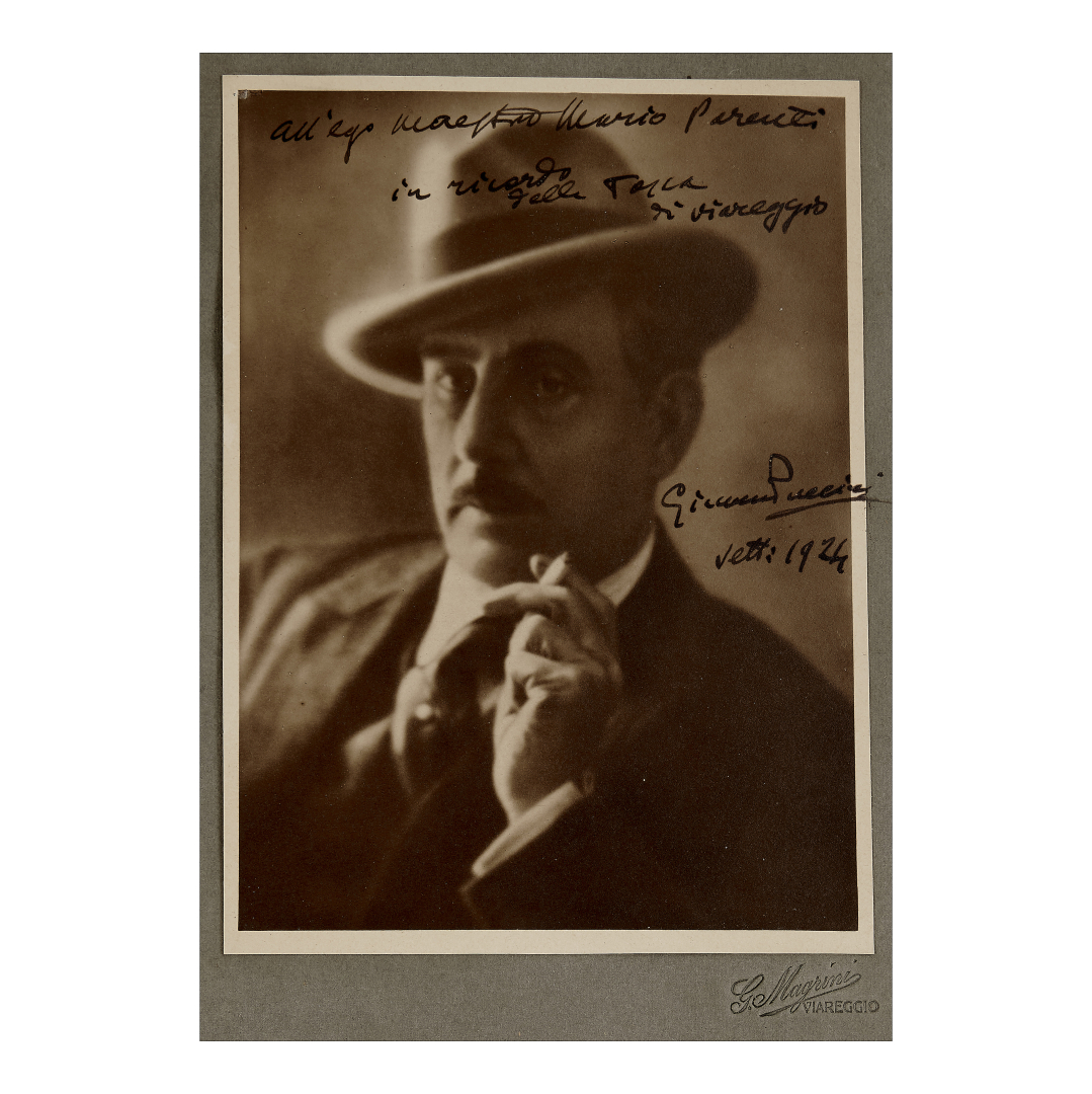 Puccini, Giacomo. Magnifico ritratto fotografico (230 x 170 mm) montato su cartoncino (G. Magrini, Viareggio) del grande compositore con il cappello e l’immancabile sigaro toscano tra le dita con firma e dedica autografa “All’egr. Maestro Mario Parenti in ricordo della Tosca di Viareggio” datata “sett. 1924”, due soli mesi prima della scomparsa avvenuta a Bruxelles il 29 novembre dello stesso anno. Tra gli ultimi autografi rilasciati in vita da uno degli operisti più amati di sempre.