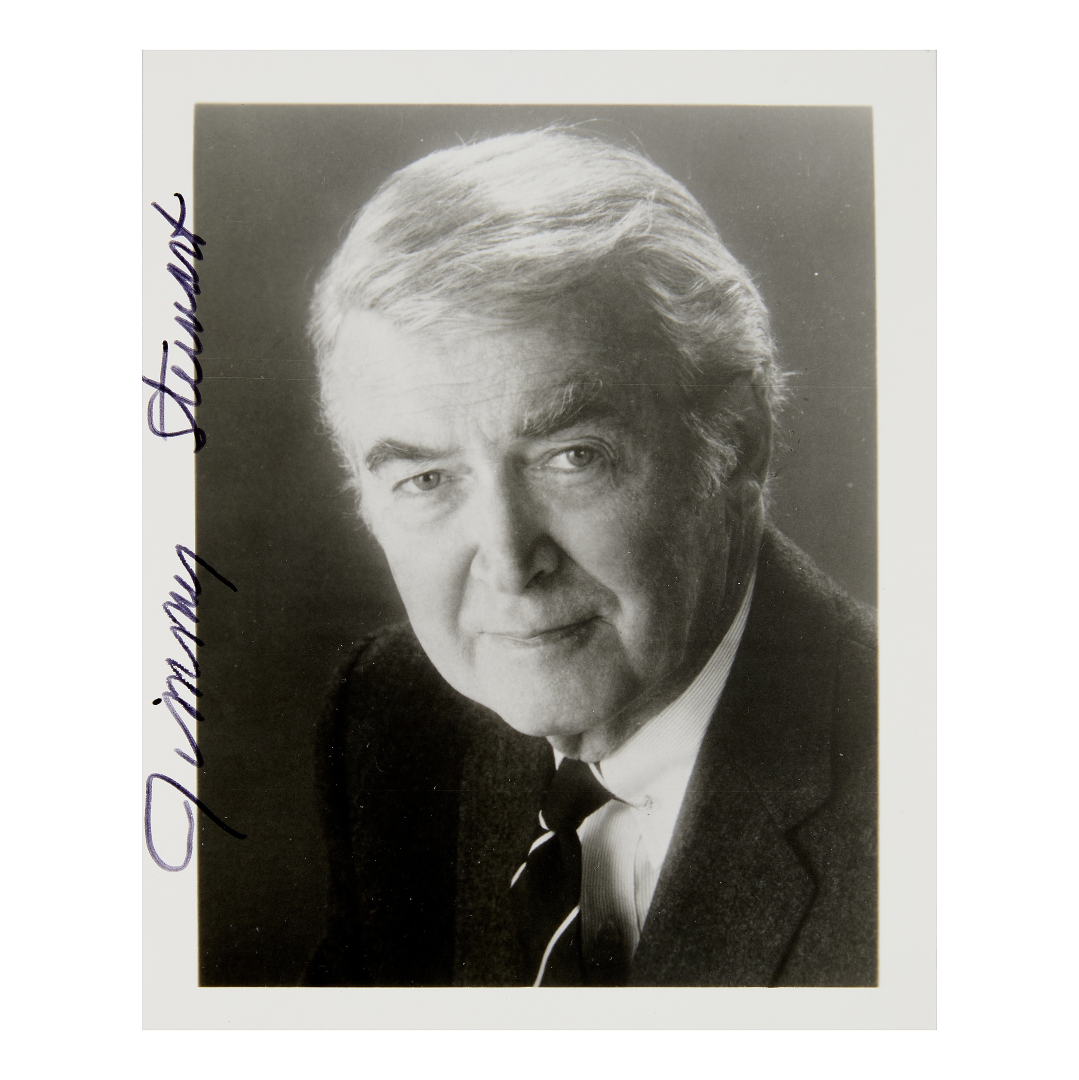 Stewart, Jimmy. Firma autografa dell’attore statunitense in età matura su elegante fotografia in bianco e nero (125 x 100 mm).