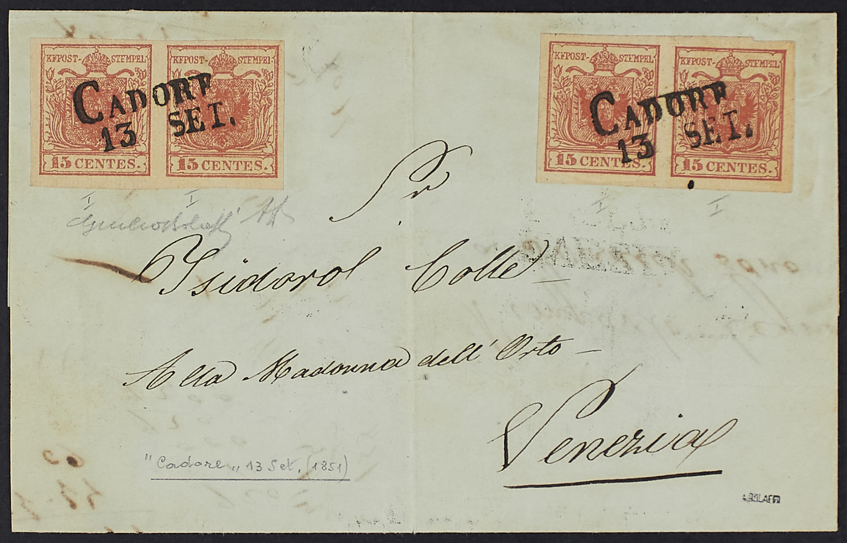1850/51 - 15 c. rosso vermiglio I tipo coppia orizzontale + carta a mano 15 c. rosso vermiglio I tipo coppia orizzontale su lettera del 13 settembre da Cadore per Venezia - Rara - Ex collezione Capellaro - Cert. Bolaffi e Diena