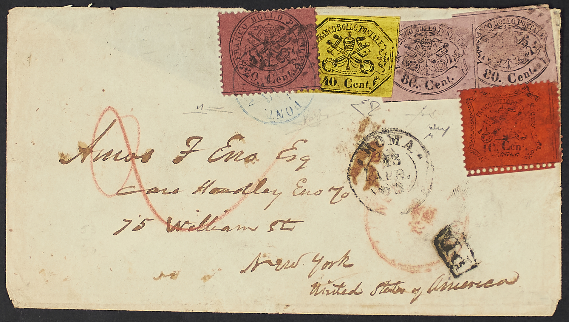 1867/68 - 80 c. rosa lillaceo due esemplari + 40 c. giallo in affrancatura mista "quadricolore" con III emissione 10 c. vermiglio arancio + 20 c. rosso indiano su busta del 13 aprile 1868 da Roma per New York - Da esaminare - Cert. Diena e Manzoni