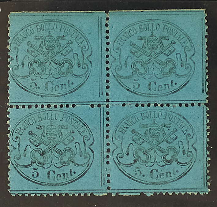 1868 - 5 c. azzurro blocco di quattro di cui tre con varietà senza punto dopo "5" - Cert. Sorani del blocco di provenienza