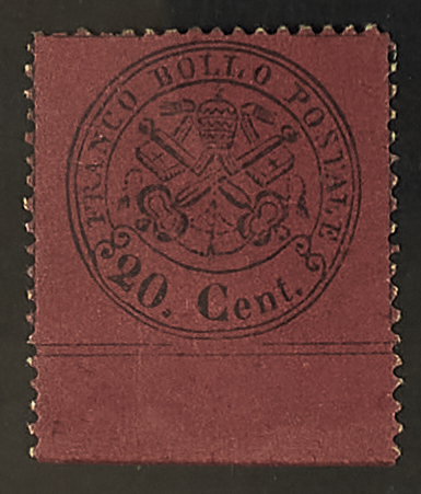 1868 - 20 c. rosso bruno bordo di foglio inferiore non dentellato in basso - Cert. Avi e Sorani