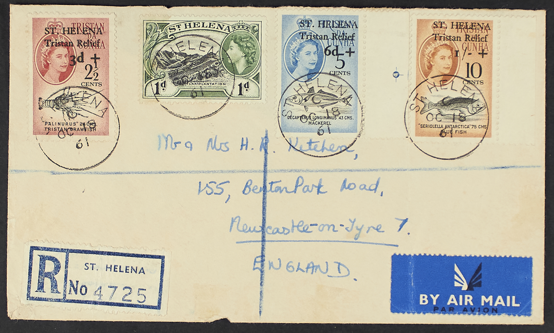 1961 - Soprastampati "Tristan Relief" tre valori su raccomandata del 18 ottobre per Londra + 9d. + 7 1/2 sciolto usato - Cert. B.P.A.