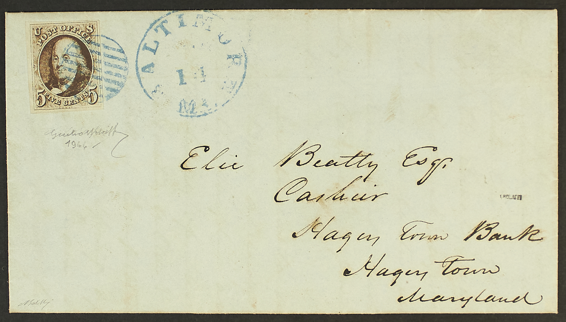 1847 - Prima emissione 10 c. nero su lettera del 18 settembre 1850 da Troy per Montreal - Unita altra lettera del 12 febbraio 1848 da Baltimora per il Maryland affrancata con 5 c. bruno della stessa emissione - Insieme splendido - Cert. Bolaffi