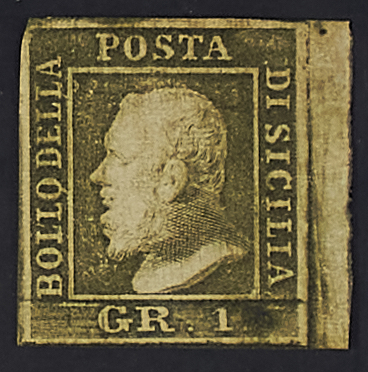 1859 - 1 gr. III tavola verde oliva chiaro cinque esemplari di cui uno bordo di foglio a destra - Firme E.D., A.D. e Raybaudi