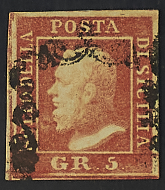 1859 - 5 gr. II tavola vermiglio annullato - Cert. Sorani