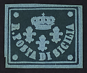 1858 - Saggio Barone in verde su carta azzurra - Raro - Cert. Raybaudi