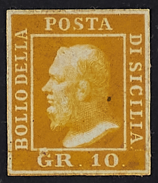 1858 - Juvara - Prova da 10 gr. in giallo su carta bianca - Piccolo difetto della carta sopra la "G" di "GR" ma esemplare molto raro - Cert. Diena