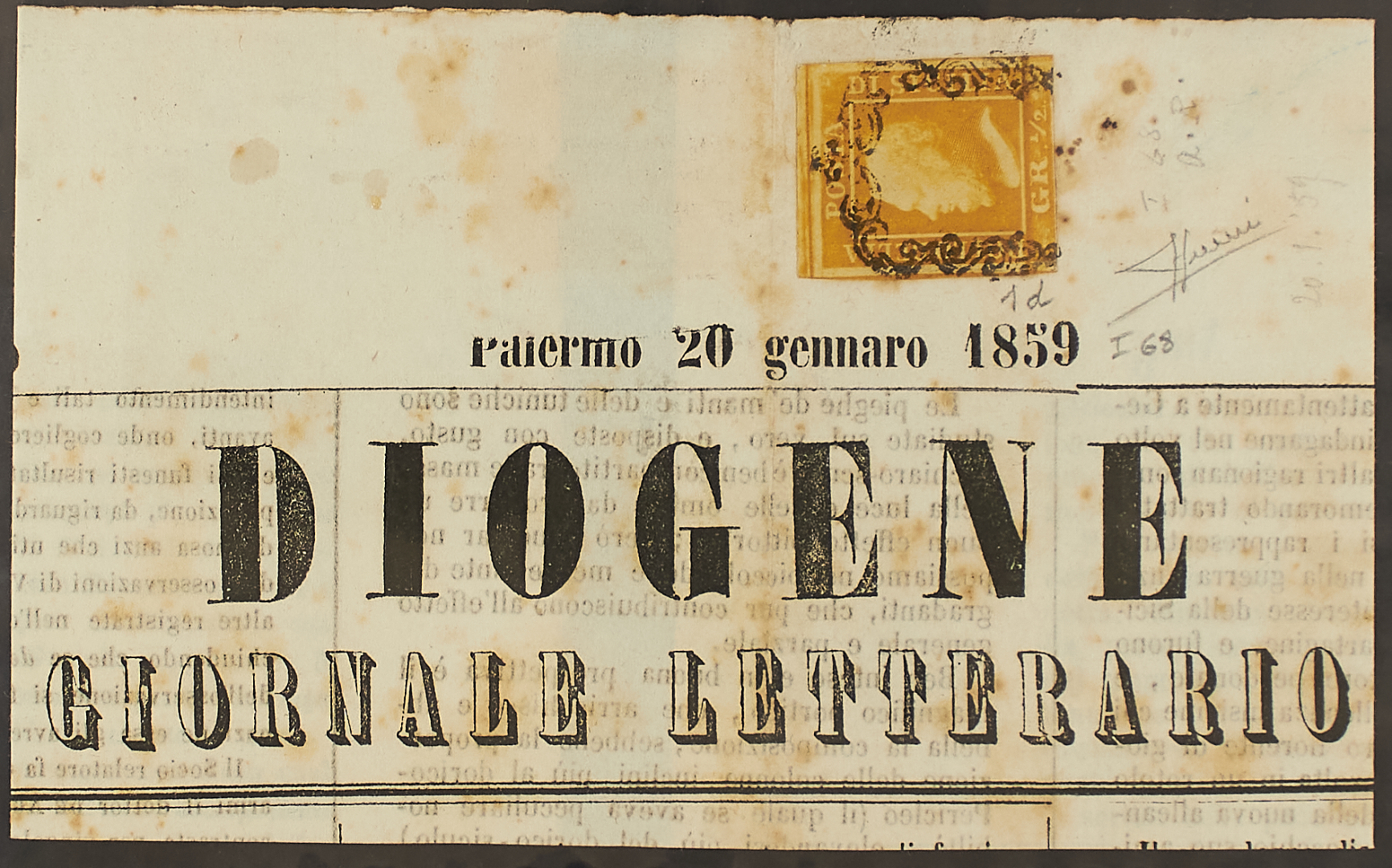 1859 - 1/2 gr. I tavola giallo chiaro su testata del giornale "Diogene" del 20 gennaio annullato a Palermo - Raro - Cert. Bottacchi e Sorani