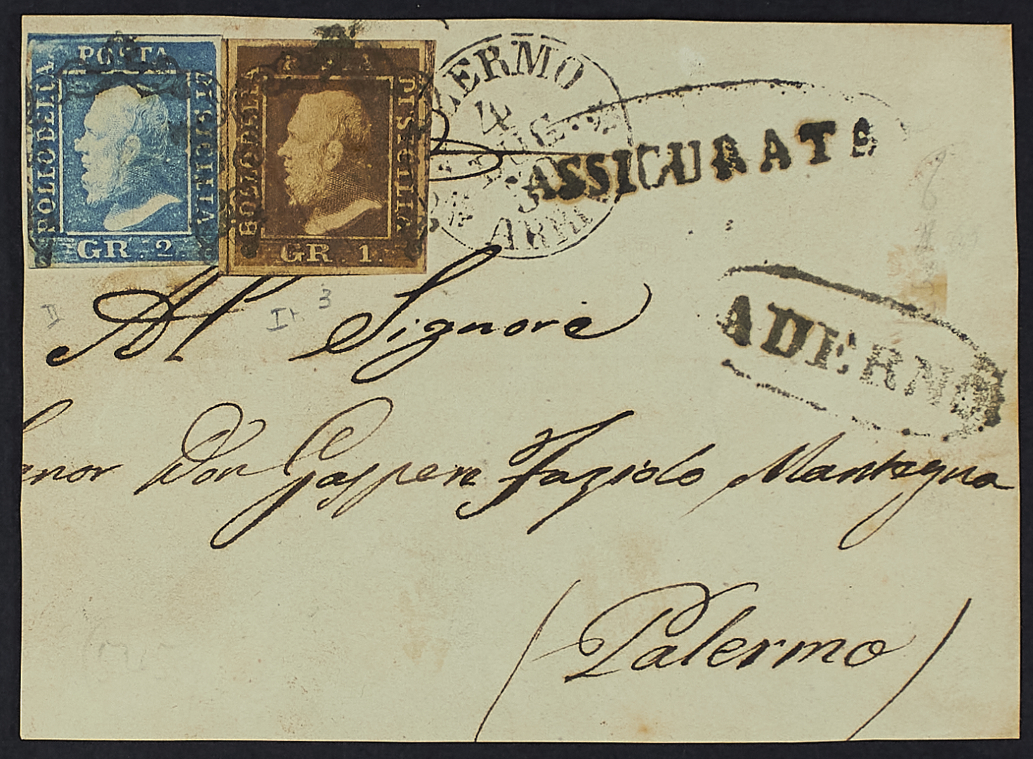 1859 - 1 gr. I tavola bruno ruggine + 2 gr. II tavola azzurro su frontespizio di assicurata del 4 luglio da Adernò per Palermo - Unita lettera del 17 febbraio da Palermo per Polizzi affrancata con 1 gr. I tavola bruno ruggine + 2 gr. azzurro - Insieme non comune - Firma A.D.