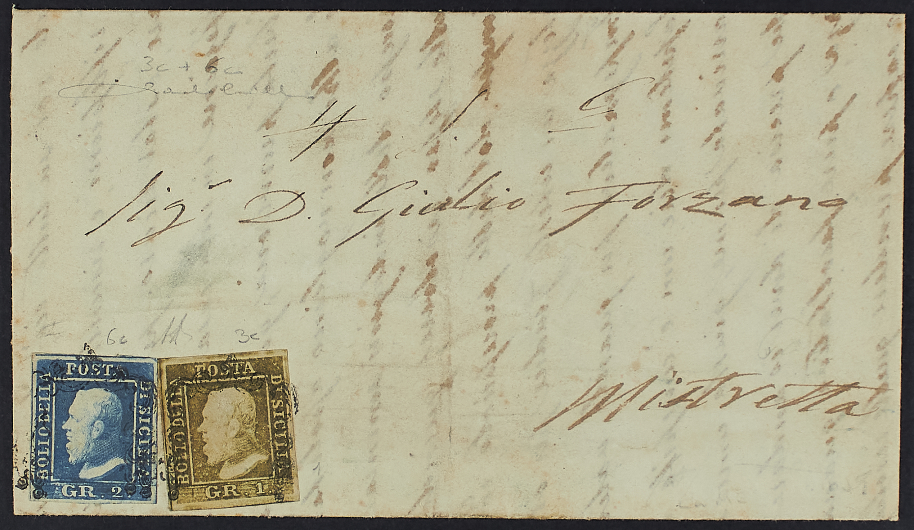 1859 - 1 gr. I tavola II stato verde oliva grigiastro + 2 gr. I tavola cobalto su lettera del 30 gennaio da Messina per Mistretta - Inconsueta mancanza del bollo di partenza sulla soprascritta - Documento raro - Da esaminare - Cert. Cardillo - Firma A. D.