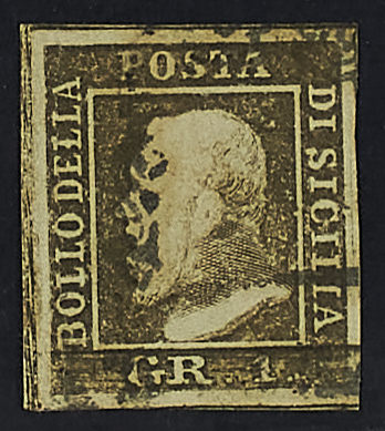 1859 - 1 gr. I tavola II stato bruno olivastro - Unito altro esemplare nella gradazione cromatica bruno oliva grigiastro - Da esaminare - Cert. Raybaudi - Firma E. Diena