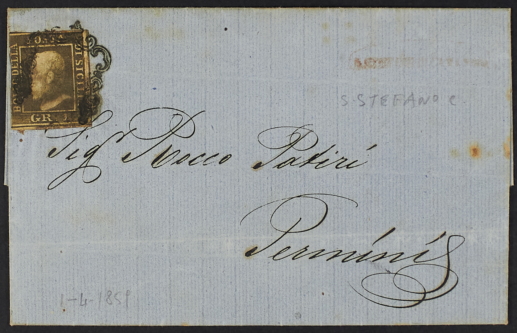 1859 - 1 gr. II tavola verde oliva grigiastro isolato su lettera non tassata del 1° aprile da S.Stefano di Canastra per Termini - Rara - Da esaminare