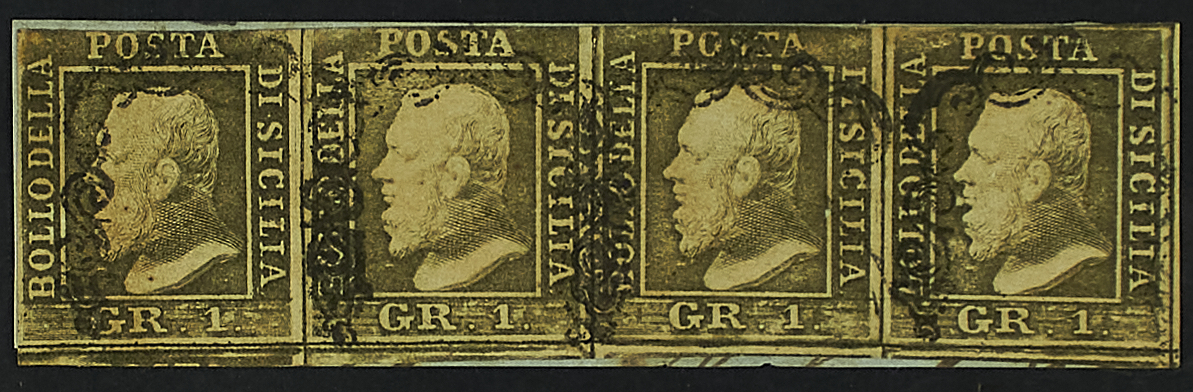 1 GR. II TAVOLA OLIVA GRIGIASTRO CARTA DI NAPOLI STRISCIA ORIZZONTALE DI QUATTRO