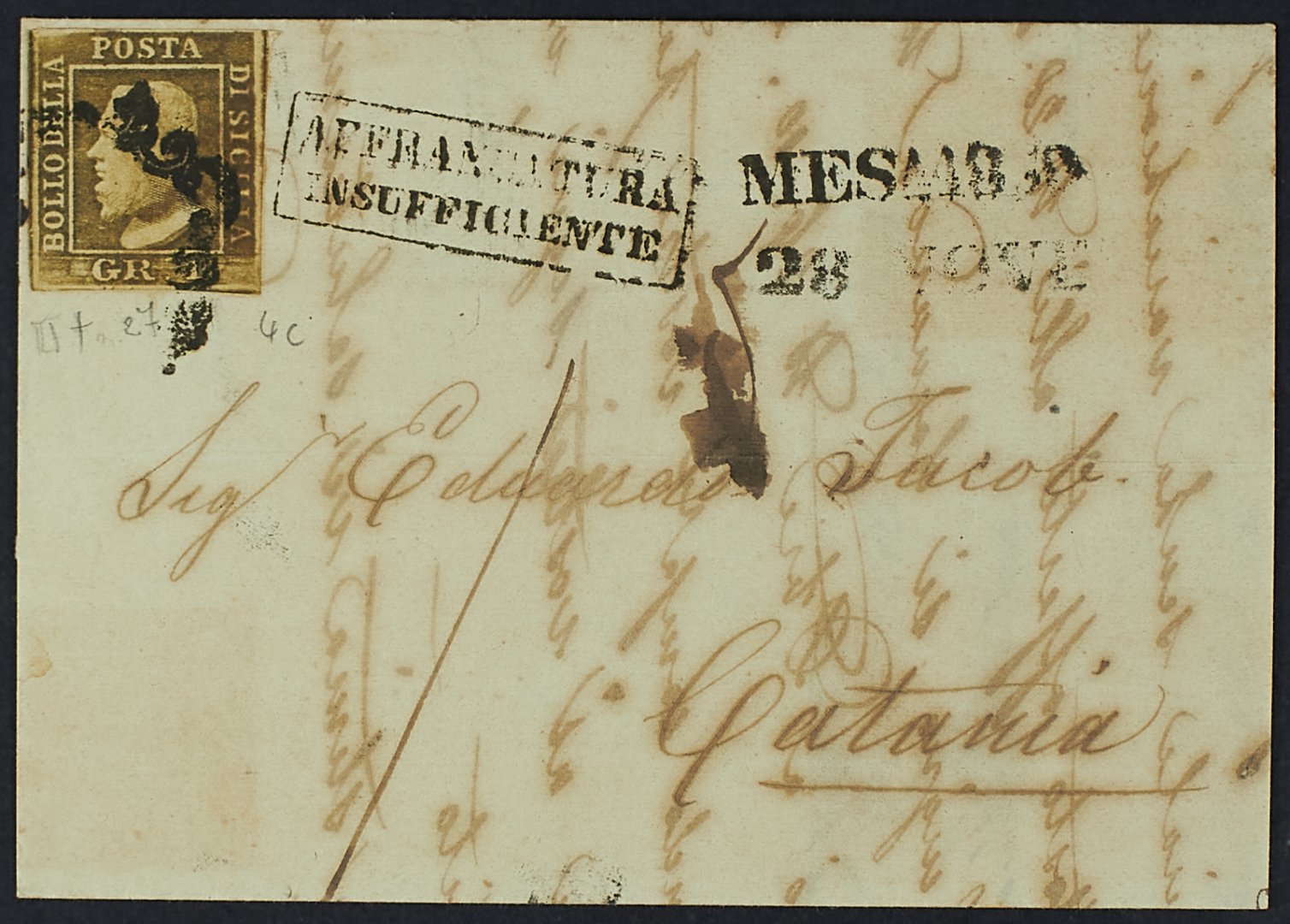 1859 - 1 gr. II tavola bruno oliva isolato su lettera tassata del 28 novembre da Messina per Catania