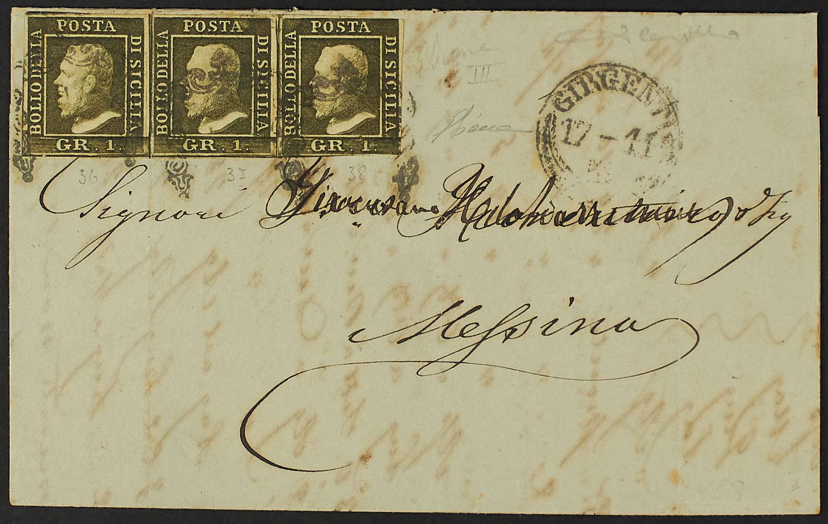 1859 - 1 gr. III tavola verde oliva scuro carta di Palermo striscia orizzontale di tre esemplari su lettera del 17 novembre da Girgenti per Messina - Cert. Diena - Firma Cardillo