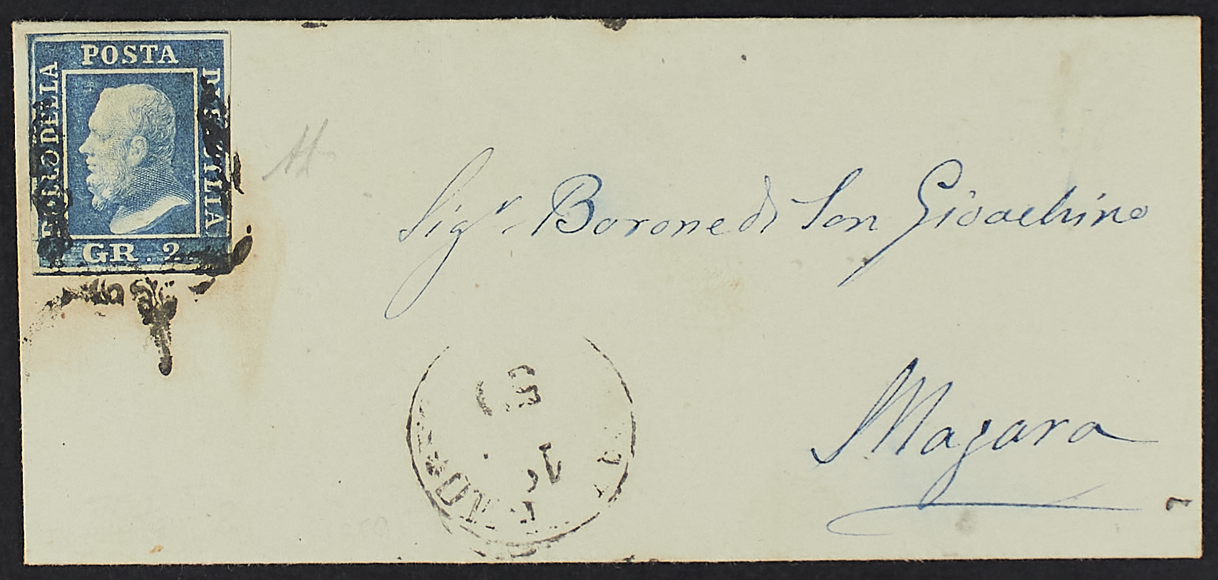 1859 - 2 gr. I tavola azzurro su lettera di piccolo formato da Palermo per Mazara - Unita altra lettera con 2 gr. del 22 febbraio da Palermo per Trapani - Entrambe con annullo a "ferro di cavallo" applicato al rovescio