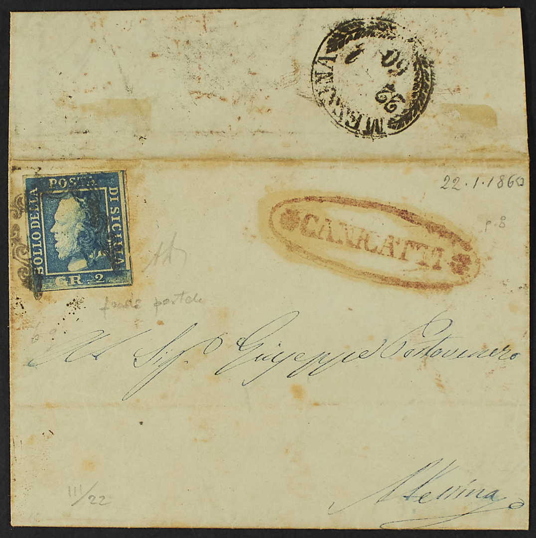 1859 - 2 gr. I tavola azzurro riutilizzato in frode su lettera del 18 gennaio 1860 da Canicattì, ovale con fregio in rosso sulla soprascritta, per Messina - Firma A.D.