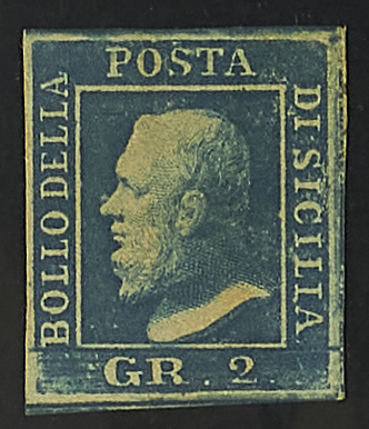 1859 - 2 gr. I tavola azzurro carta di Napoli - Allegato altro esemplare carta di Palermo - Cert. Sorani - Firme E.D e A.D.