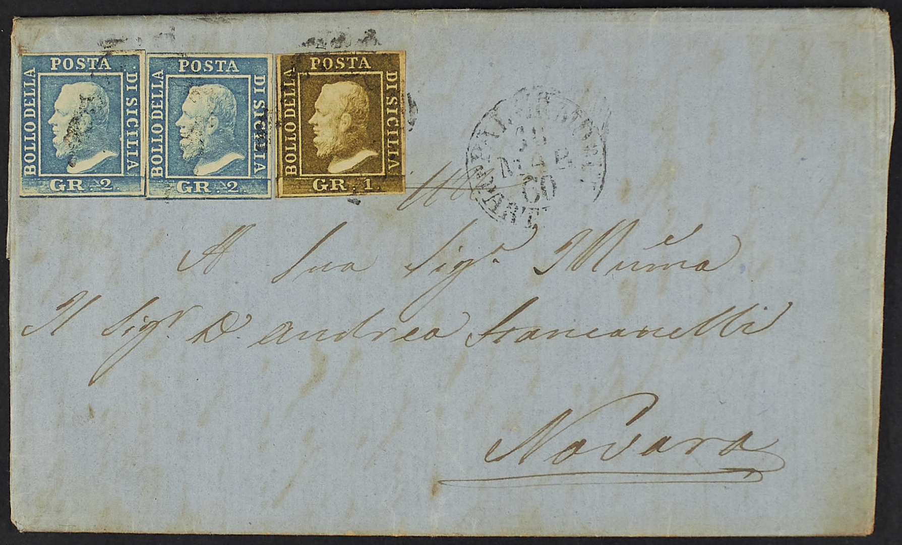 1859 - 1 gr. II tavola verde oliva grigiastro + 2 gr. I tavola azzurro due esemplari su lettera del 30 marzo 1860 da Palermo per Novara - Non comune - Da esaminare