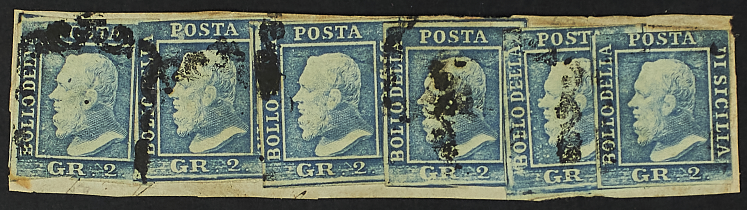1859 - 2 gr. azzurro I tavola coppia orizzontale + 2 gr. azzurro III tavola su piccolo frammento - Unito altro frammento con tre esemplari del 2 gr. I tavola e due esemplari III tavola - Cert. Sorani - Firme A.D. e Grioni