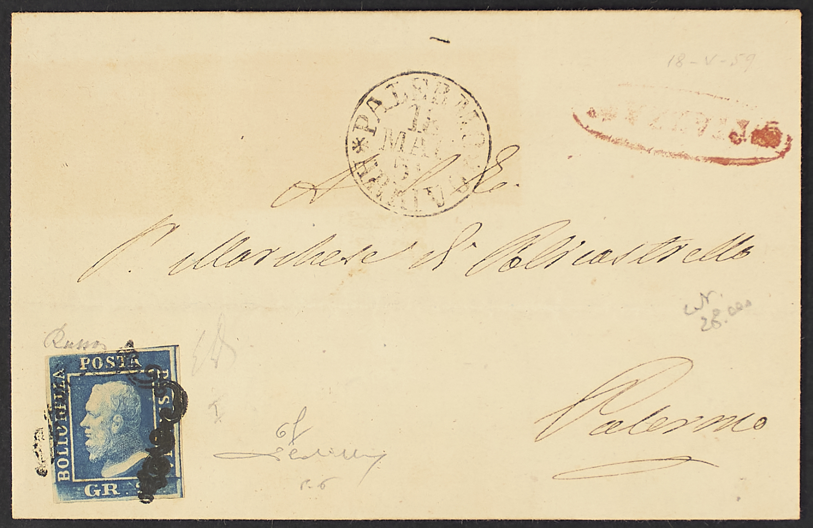 1859 - 2 gr. I tavola azzurro vivo su lettera del 18 maggio da Piazza per Palermo - Molto bella - Cert. Cardillo - Firma E.D.