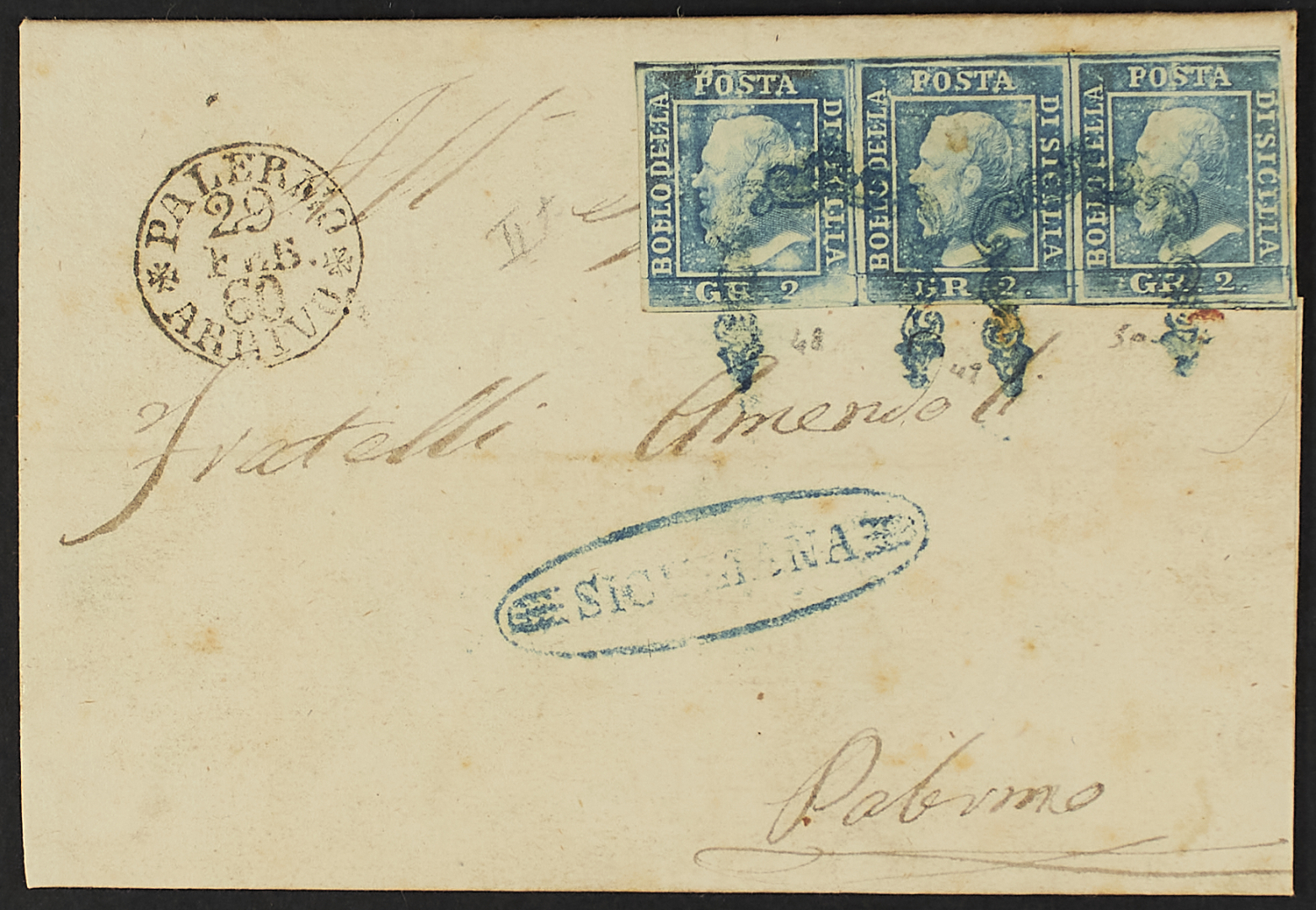 1859 - 2 gr. II tavola azzurro chiaro striscia orizzontale di tre esemplari (pos. 48/50) su lettera del 28 febbraio 1860 da Siculiana per Palermo