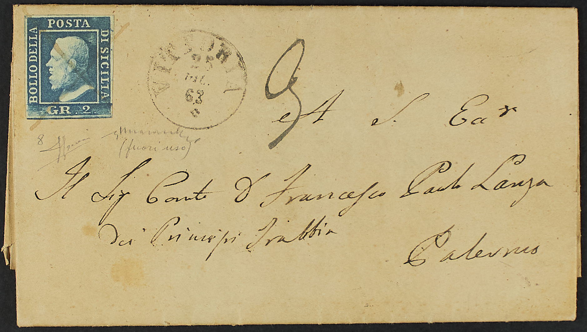 1859 - 2 gr. III tavola azzurro carta di Palermo su lettera del 25 dicembre 1863 da Vittoria per Palermo - Di grande rarità per l'utilizzo di un francobollo borbonico tre anni dopo la sua validità postale - Esemplare annullato con due tratti di penna e lettera tassata per 30 centesimi - Cert. Sorani - Firma Giovanni Chiavarello