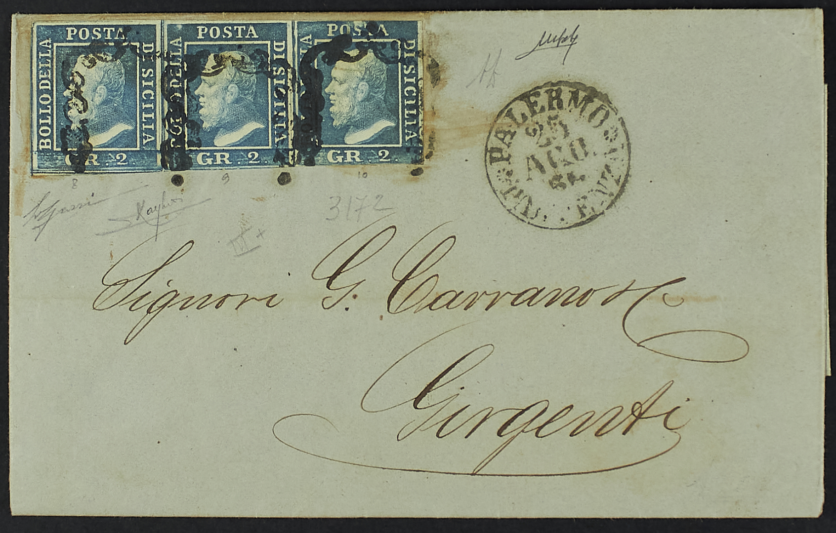 1859 - 2 gr. III tavola azzurro chiaro striscia orizzontale di tre esemplari su lettera del 25 agosto da Palermo per Girgenti - Da esaminare - Cert. Raybaudi - Firma A.D.