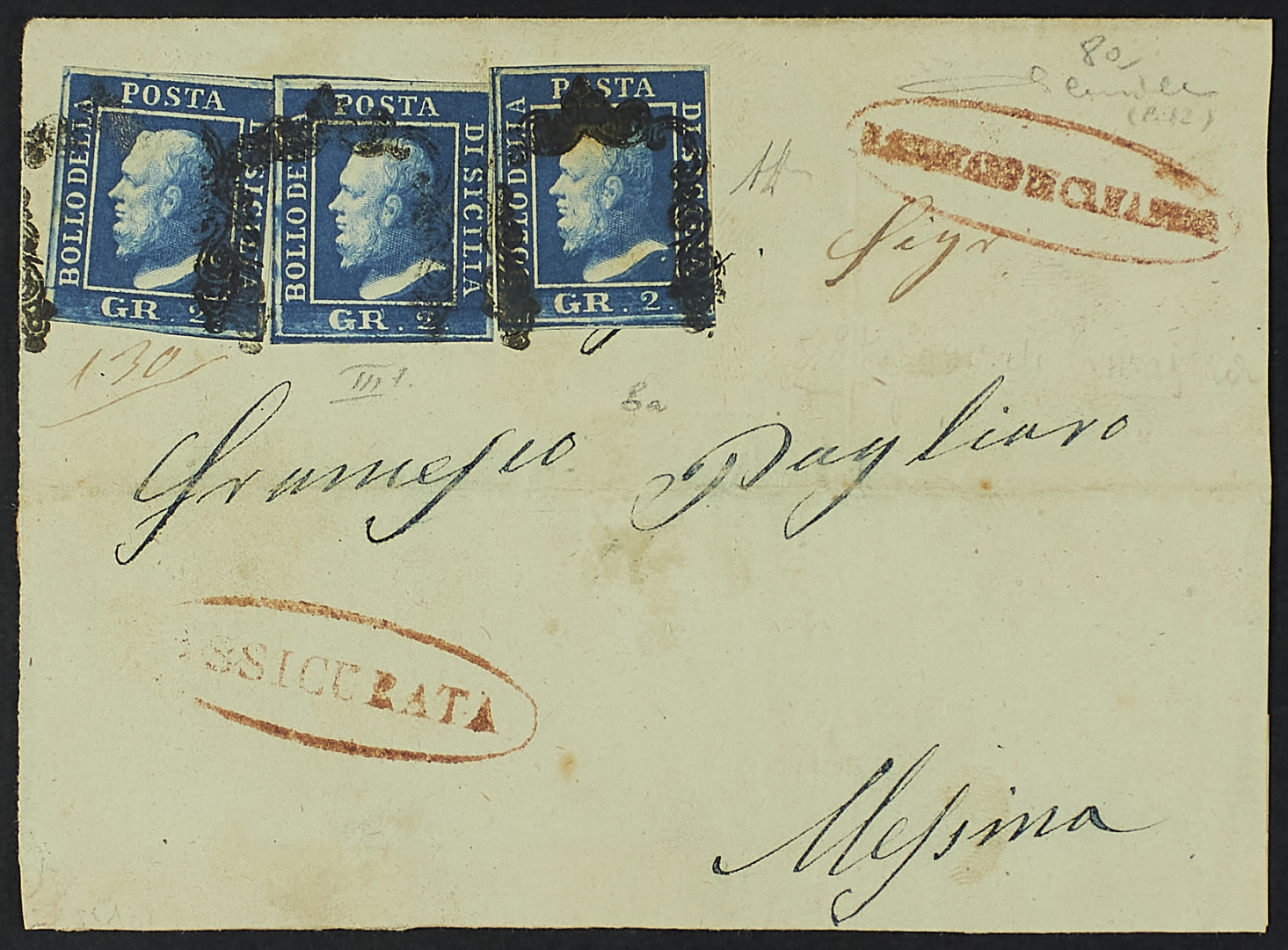 1859 - 2 gr. III tavola azzurro scurissimo tre esemplari su assicurata del 28 luglio da S. Stefano di Camastra, ovale in rosso sulla soprascritta, per Messina - Documento non comune e francobolli ben conservati nel colore - Cert. Cardillo - Firma A.D.