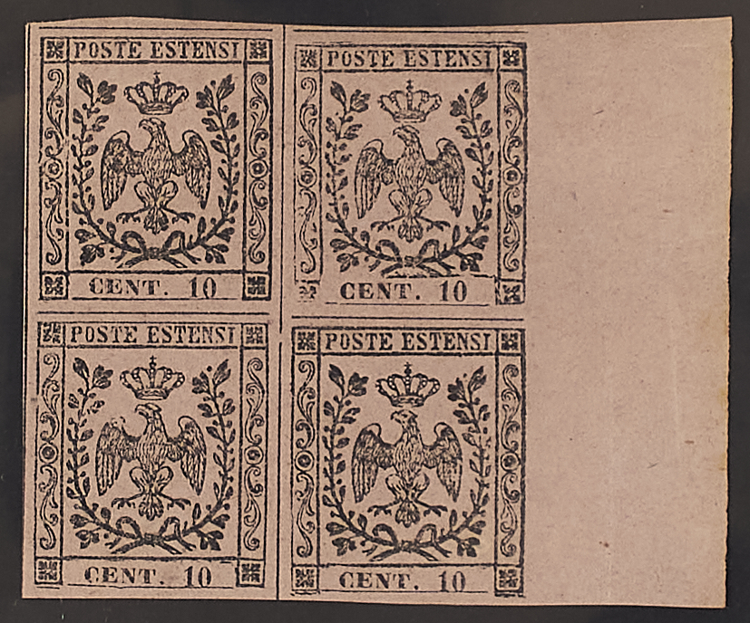 1852 - 10 c. rosa blocco di quattro bordo di foglio a destra - Cert. Cardillo