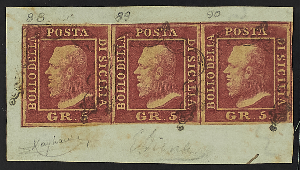 1853 - 5 gr. I tavola rosa carminio striscia orizzontale di tre esemplari (pos. 88/90) su piccolo frammento - Cert. Diena