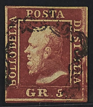 1859 - 5 gr. I tavola carminio scuro - Cert. Diena