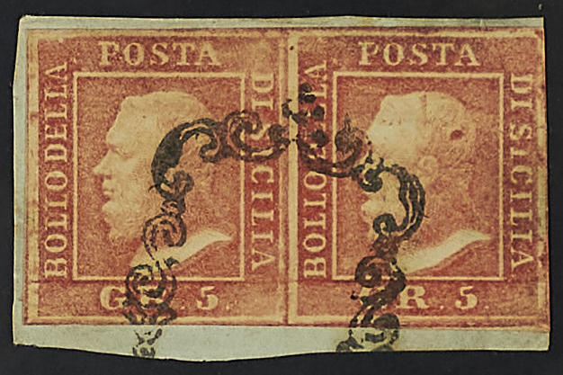 1859 - 5 gr. I tavola vermiglio chiaro coppia orizzontale su piccolo frammento - Molto rara - Cert. Cardillo - Firma E. Diena