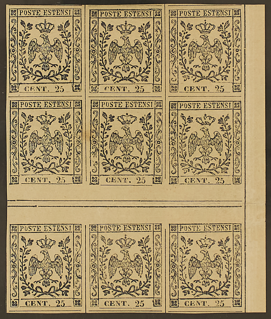 1852 - 25 c. camoscio blocco di nove esemplari comprendente tre coppie verticali con interspazio di gruppo
