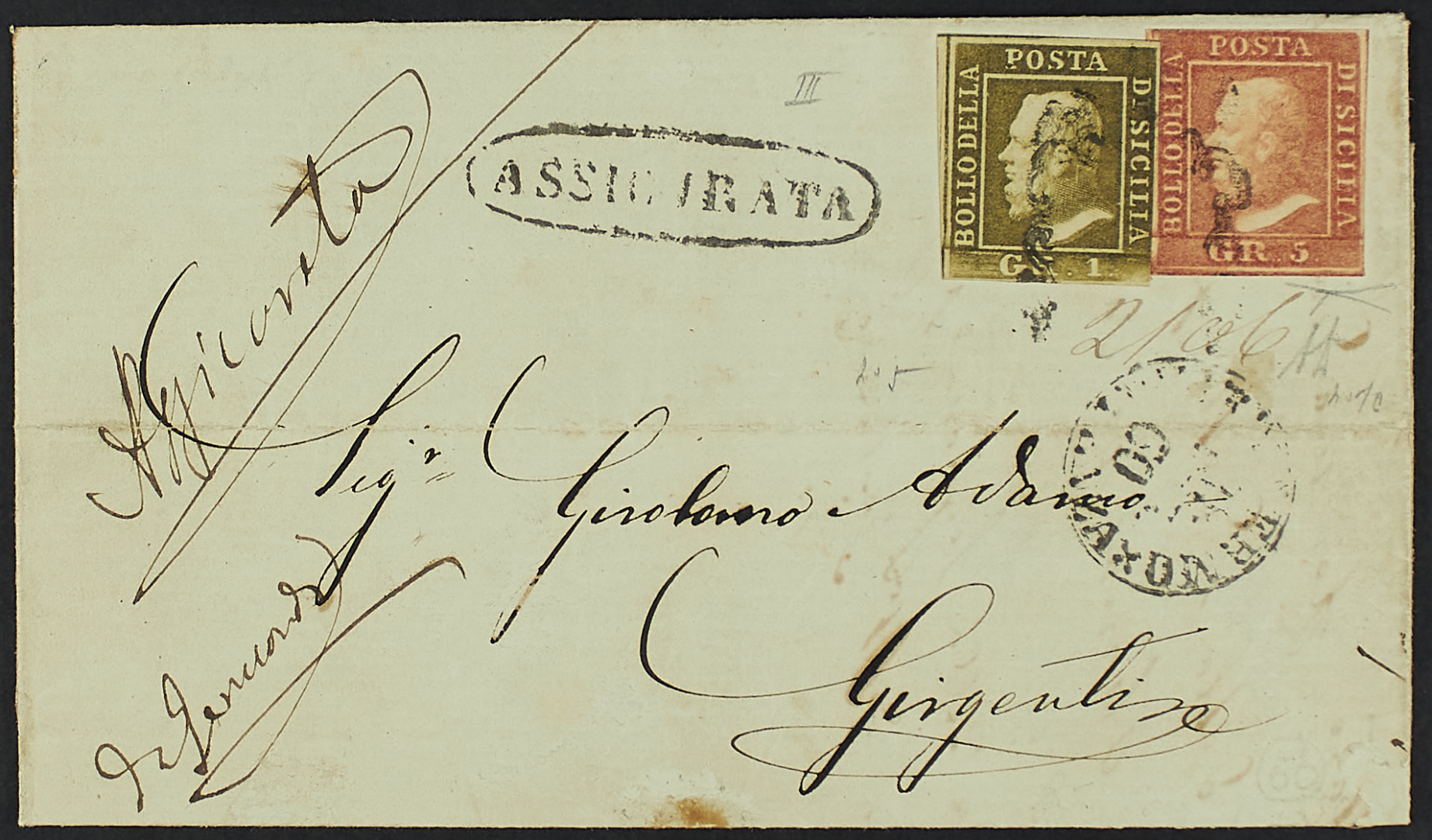 1859 - 5 gr. I tavola vermiglio + 1 gr. III tavola verde oliva chiaro su assicurata del 18 febbraio 1860 da Palermo per Girgenti - Documento ben conservato e di notevole rarità - Cert. Bottacchi - Firma A.D.