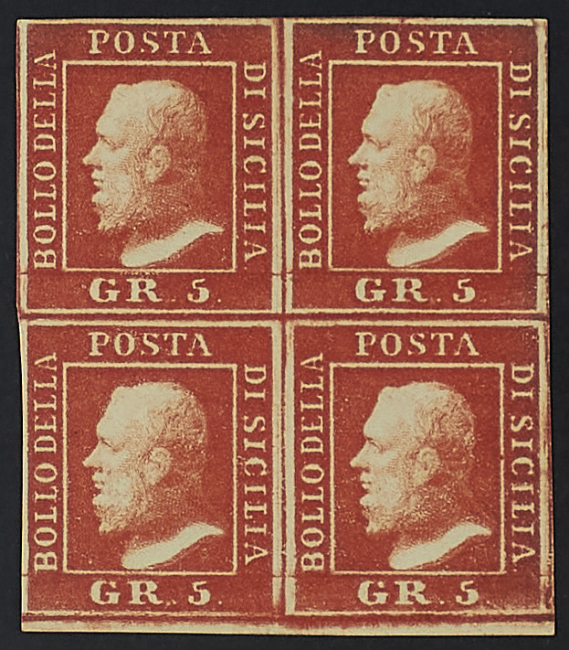 5 GR. II TAVOLA VERMIGLIO VIVO BLOCCO DI QUATTRO ESEMPLARI