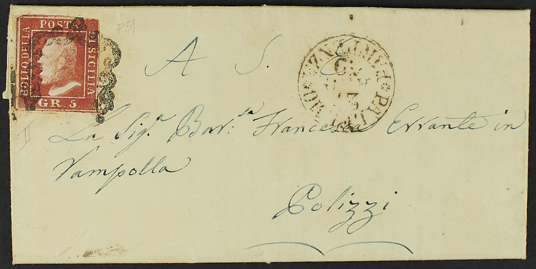 1859 - 5 gr. II tavola vermiglio isolato su lettera del 26 agosto da Palermo per Polizzi - Estremamente raro - Cert. Cardillo