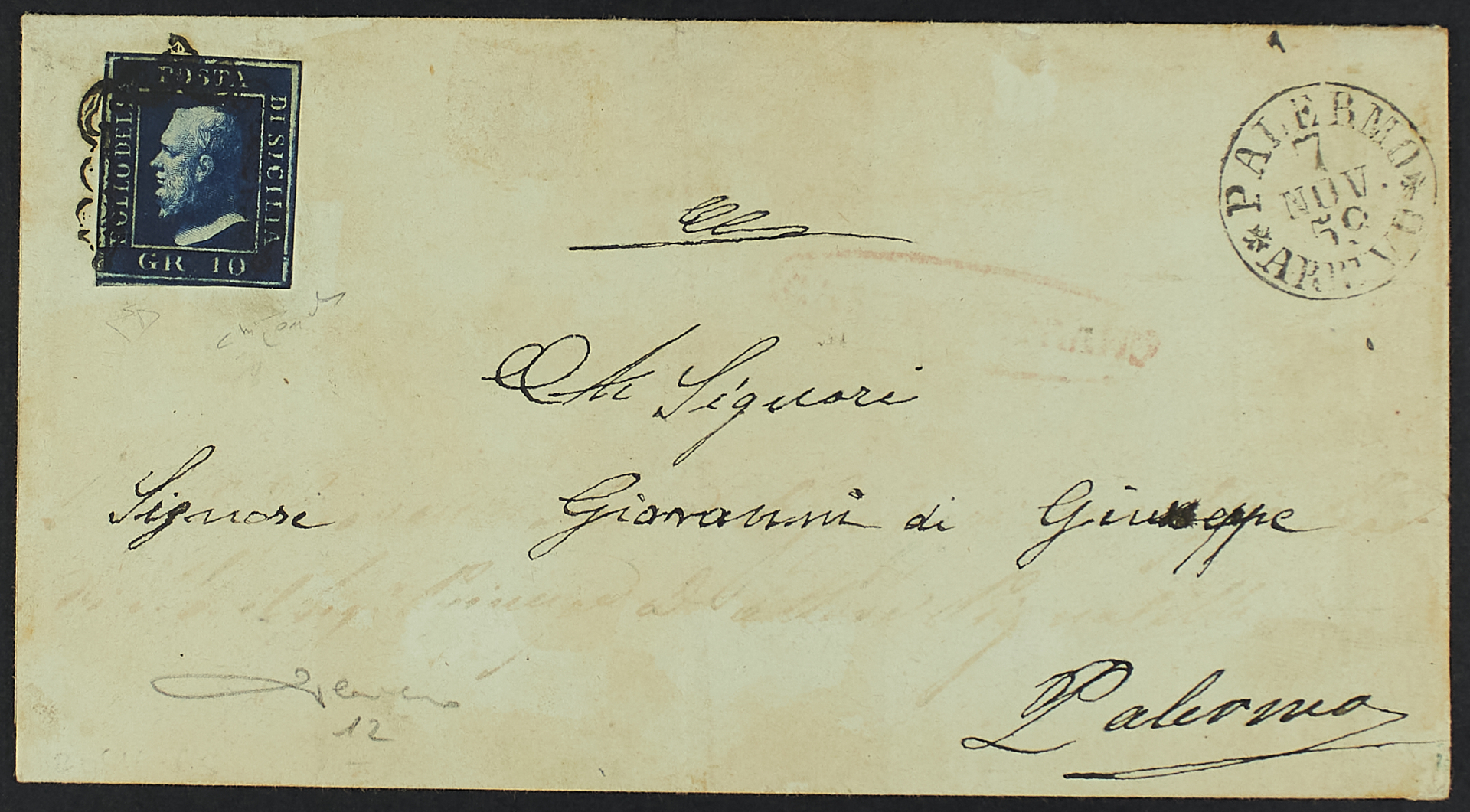 1859 - 10 gr. azzurro cupo su lettera del novembre da Castelvetrano per Palermo - Indirizzo parzialmente rifatto - Firme Cardillo, En. D. e Raybaudi